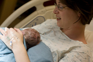 I went into labor on Monday and still managed to go to Bunko that night! My mom made it to the house by 10pm, our friend Debbie showed up at 4am to watch Caleb, and we headed to the hospital at 5am on Tuesday morning. Labor was WAY different than the first time. I knew it would be different, but I didn't realize HOW different. Contractions were completely manageable all the way to the point of pushing. And then pushing? Wow, that was a trip. Doing it naturally is insane. Not because of the pain, but because of the power. I had no idea I could push so hard, and it's now no wonder to me that Caleb needed vacuum extraction, because there's no way I was pushing that hard when he was born.